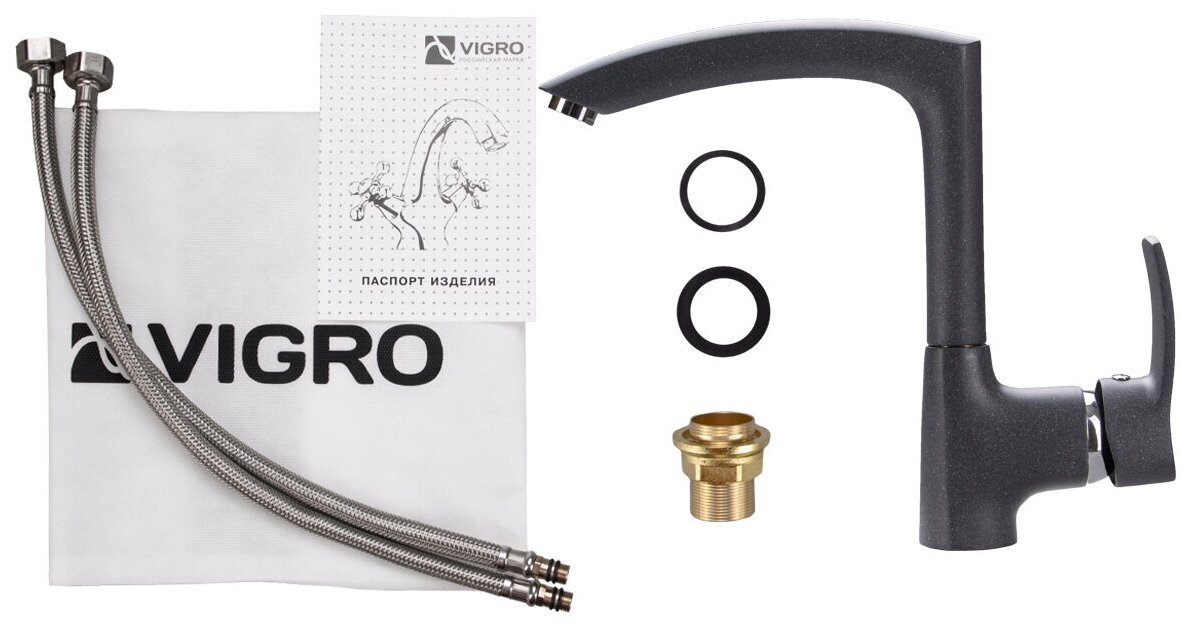 Лучшие цены. Смеситель для кухни VIGRO VG903 имеет современный дизайн, прост в установке и использовании. Мытье посуды и кухонной раковины будет происходить легко и просто. Смеситель для равковины выполнен из высококачественной латуни, что обеспечивает его стойкость к перепадам давления и температуры, тем самым подчеркивает свою долговечность. Подводка для воды и крепеж в комплекте. Кран для кухни данной коллекции подходит для разных интерьеров и типов моек. Магазины в вашем городе.