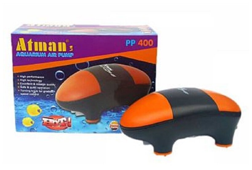 Лучшие цены. Двухканальный, супертихий, без регулятора, 460 л/ч, для аквариумов до 400 л. Atman PP-400 — супертихий двухканальный мембранный компрессор для аквариума. Предназначен для подачи воздуха в аквариум и насыщения воды кислородом. Обладает ярким дизайном в оранжево-черных цветах и необычной формой. Модель без регулятора потока воздуха. Ножки изготовлены из мягкой резины, поглощающей вибрацию. Отличается низким уровнем шума при большой мощности потока. Магазины в вашем городе.