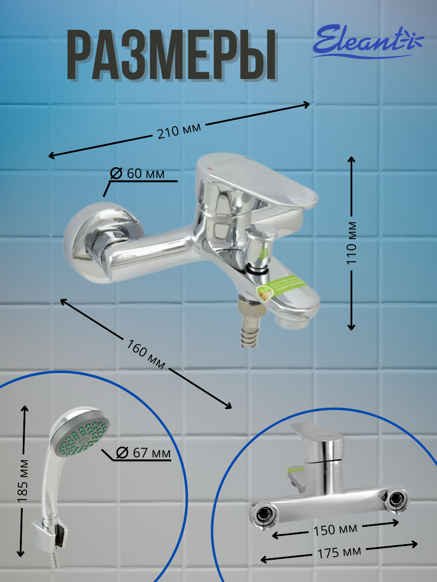 Ванно-душевой одноручный смеситель Eleanti со шлангом, хромированной лейкой и кронштейном 0402.837