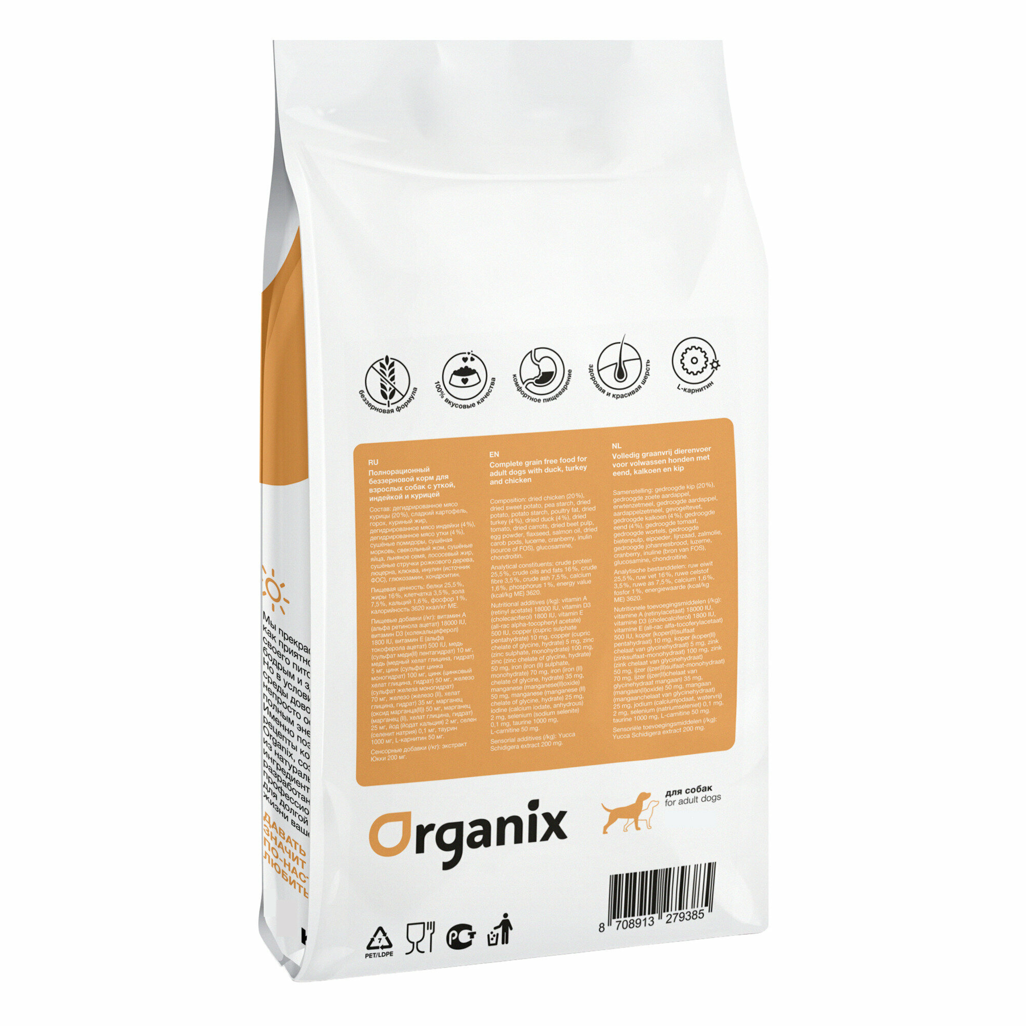 Organix полнорационный беззерновой сухой корм для активных взрослых собак 3 вида мяса: утка, индейка и курица, 18 кг