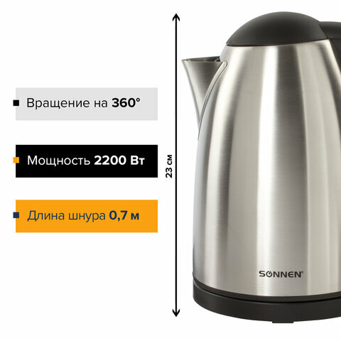 Чайник SONNEN KT-106, 1,8 л, 2200 Вт, закрытый нагревательный элемент, нержавеющая сталь, 451707