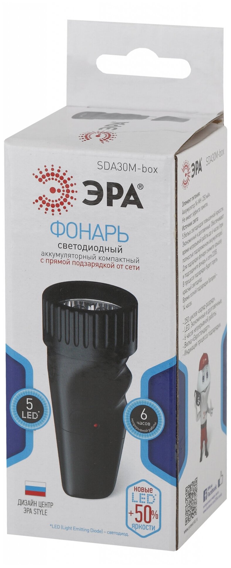 Лучшие цены. Фонарь светодиодный SDA30M-Box ЭРА NEW 5хLED, аккумулятор NiMH, карт (40/80/1280) ЭРА SDA30M - светодиодный аккумуляторный фонарь с анатомической ручкой и 5 яркими светодиодами. Имеет встроенную вилку и заряжается напрямую от электросети 220 В. Эргономичный дизайн корпуса разработан в России - в собственном дизайнерском бюро ЭРА. Свет фонаря - белый, приближен к естественному дневному. Фонарь не требует батареек, дополнительных зарядных устройств и проводов, чем очень удобен в использовании. Магазины в вашем городе.