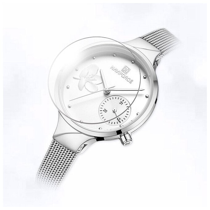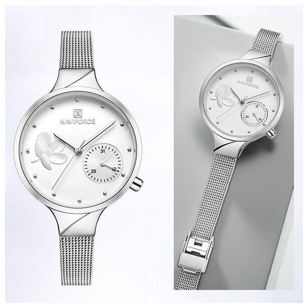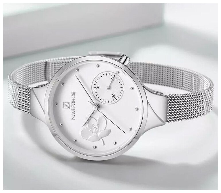 Лучшие цены. Наручные часы Naviforce NF5001S выполнены в благородном серебряном цвете. Изысканный дизайн подчеркивается нежным цветочным орнаментом и необычным форматом времени. Стальной ремешок отлично смотрится на тонком женском запястье. Такой аксессуар подчеркнет тонкое чувство стиля своей владелицы. Особенности часов Naviforce NF5001S (SWS) Крепкий корпус Кварцевый японский механизм SEIKO находится под защитой прочного корпуса из цинкового сплава. Магазины в вашем городе.