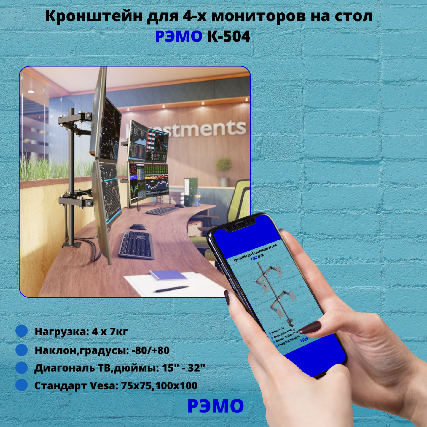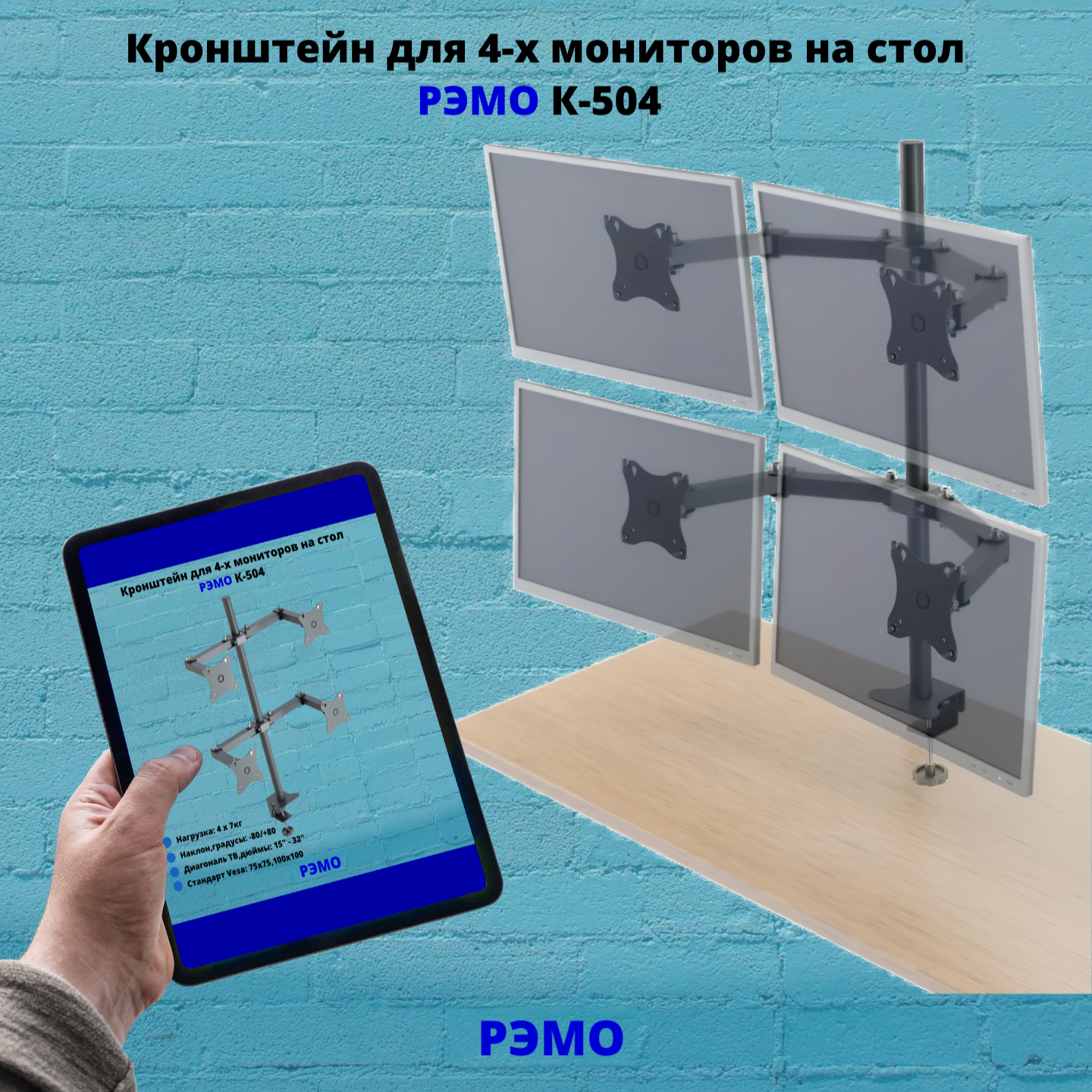Кронштейн для четырех мониторов на стол наклонно-поворотный с диагональю от 15"до 32" Рэмо К-504,чёрный