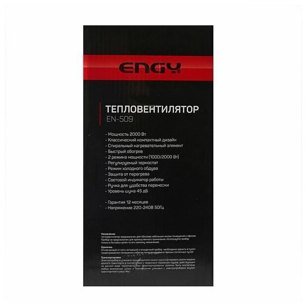 Тепловентилятор Engy EN-509 черн., 2кВт, спирал. нагрев., 3режима, ручка 20300