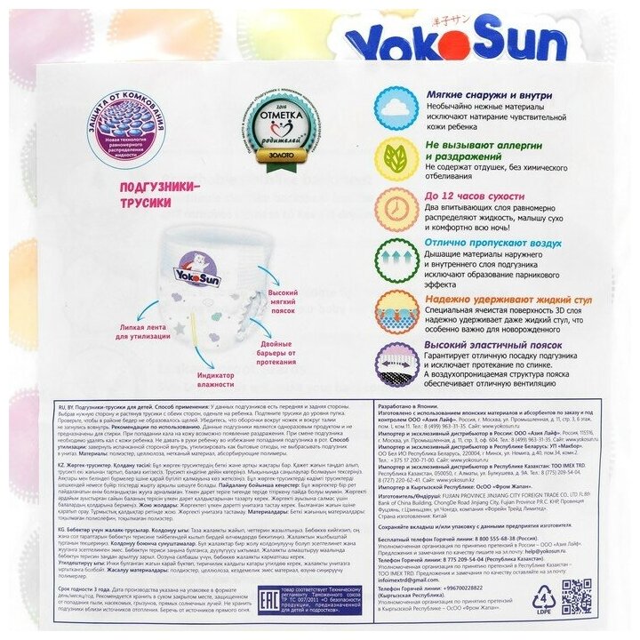 Лучшие цены. Трусики-подгузники YokoSun — это новые подгузники, отвечающие всем требованиям современных мам. Они имеют знак качества и экологичности «Эко» и рекомендованы дерматологами. В изготовлении подгузников используется японский абсорбент, который быстро впитывает влагу и удерживает её, сохраняя сухость в течение длительного времени. Эластичный поясок мягко и плотно облегает талию малыша, препятствуя подтеканию жидкости вдоль спины. Магазины в вашем городе.