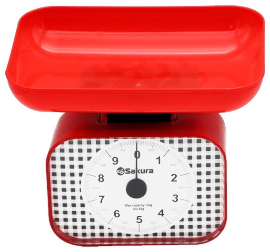 Лучшие цены. Весы Sakura SA-6016R Весы кухонные механические, максимальная нагрузка 10 кг, цена деления 50 гХарактеристикиТип управления: механическийМаксимальная нагрузка: 10 кгЦена деления: 50 гМатериал чаши: пластикЦвет корпуса: SA-6016R - красный, SA-6016GR - зеленыйВесы Sakura SA-6016R. Магазины в вашем городе.