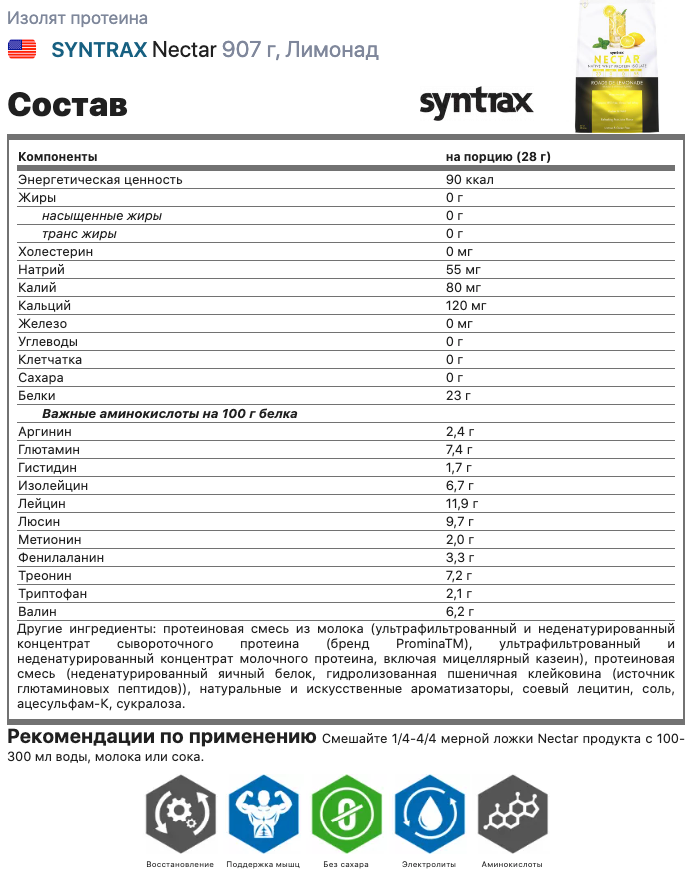 Протеин Изолят протеина SYNTRAX Nectar 907 г, Лимонад
