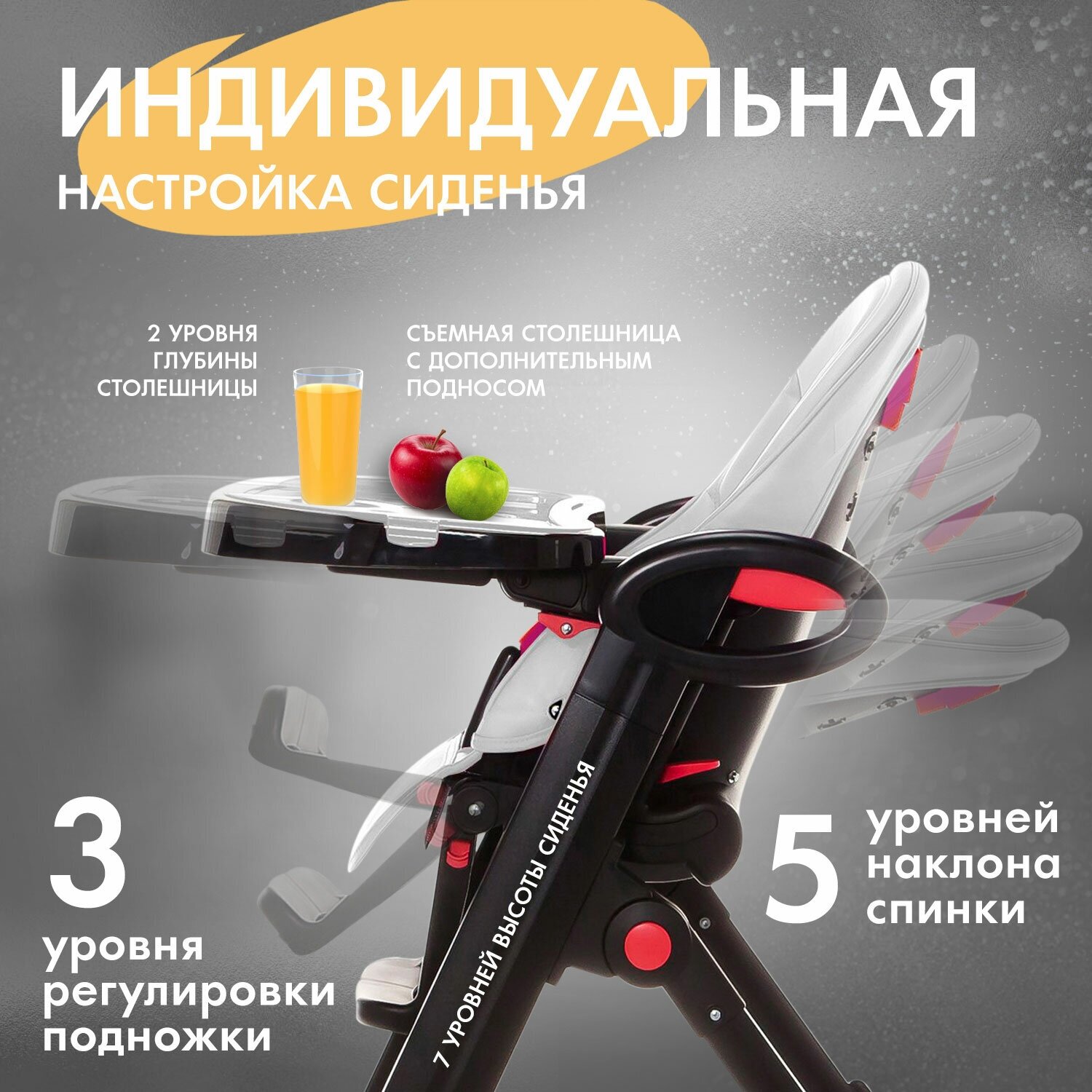 | Дополнительно | съемный столик / съемный поднос / столешница с бортиком / ремни безопасности / колеса с фиксаторами |