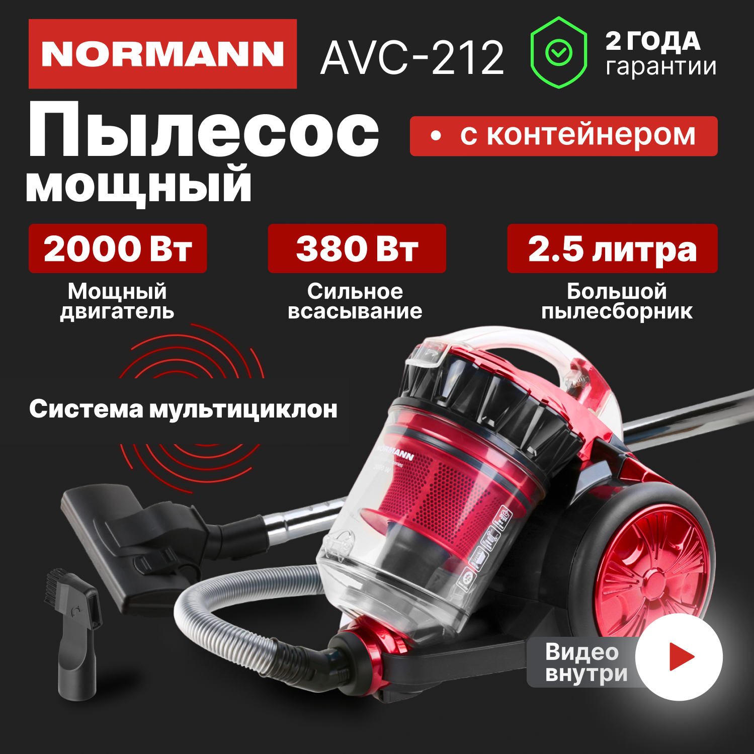 Пылесос бытовой NORMANN AVC-212 (2000 Вт; Мультициклон; Контейнер 2,5 л; Радиус действия 8 м)