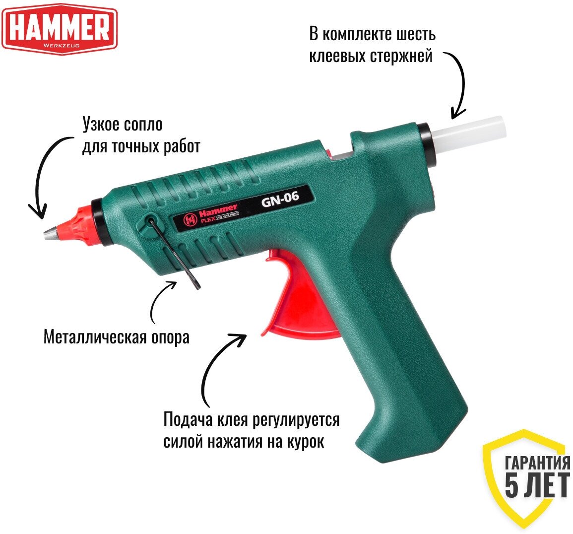 Лучшие цены. HAMMER GN-06 – сетевой клеевой пистолет, пригодится для хобби, творчества, мелкого бытового ремонта, декорирования, фиксации проводки. Мощность 80 Вт. Подходит для работы с бумагой, керамикой, картоном, деревом, пластмассой, кожей и не только. • Диаметр клеевого стержня: 11 мм • Длина клеевого стержня: 150 мм • Производительность: 22 г/мин • Гарантия: 5 лет Особенности модели GN-06: До температуры в 200 градусов, пистолет разогревается всего за 4 минуты. Не придётся долго ждать начала работы. Магазины в вашем городе.