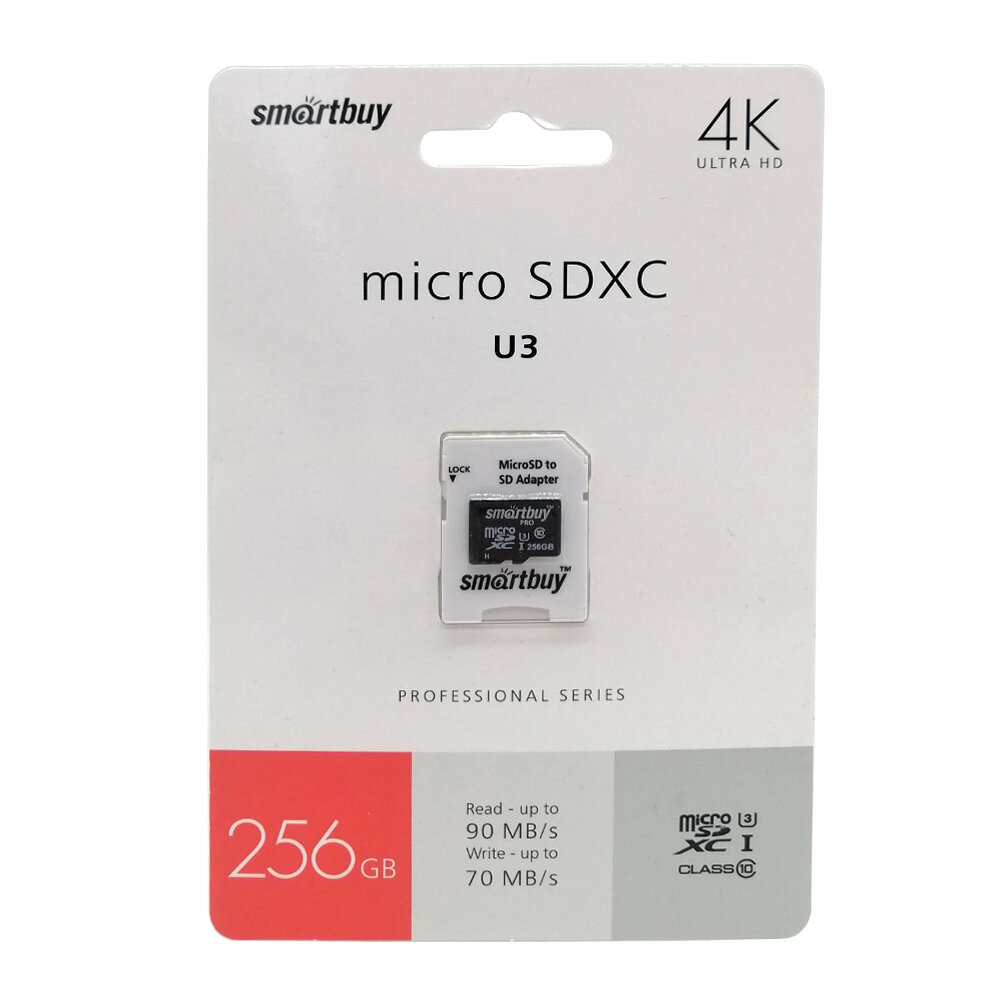 micro SDXC карта памяти Smartbuy 256GB Class10 PRO U3 R/W:90/70 MB/s (с адаптером SD)