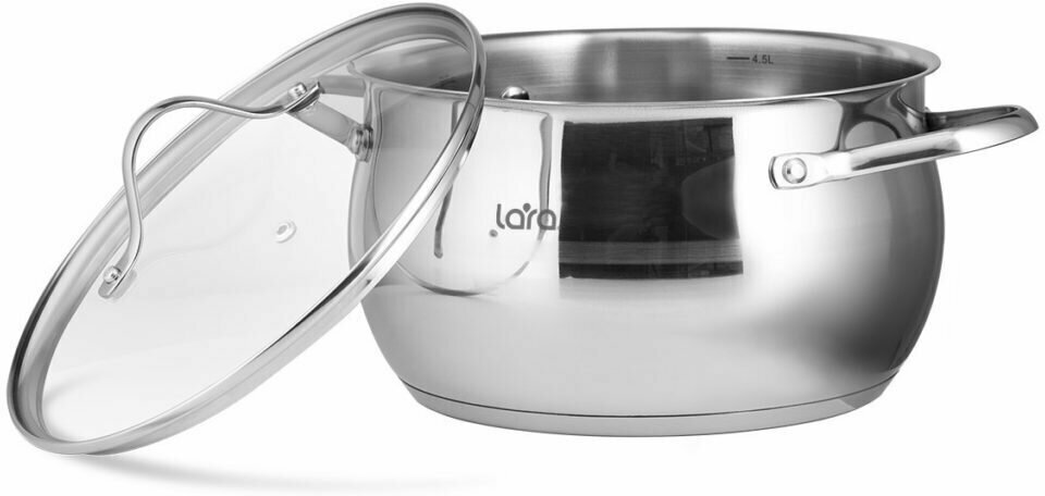 Lara Кастрюля нерж серия APPLE 26x14,5см,7.7л,стал.ручки,капсулир индукц дно,крышка стекло LR02-36