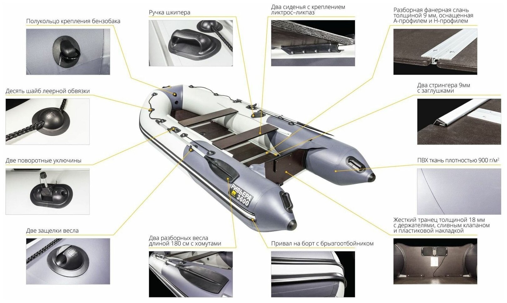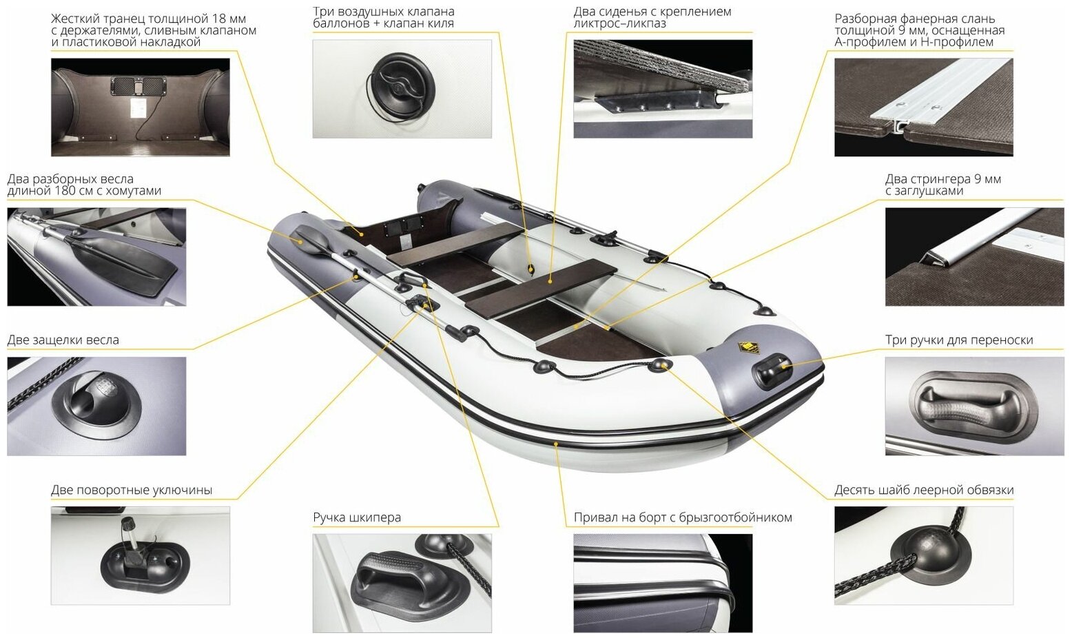 | Дополнительно | клапан спуска воды, ручки для переноски, уключины, водоотбойник, леерный трос |