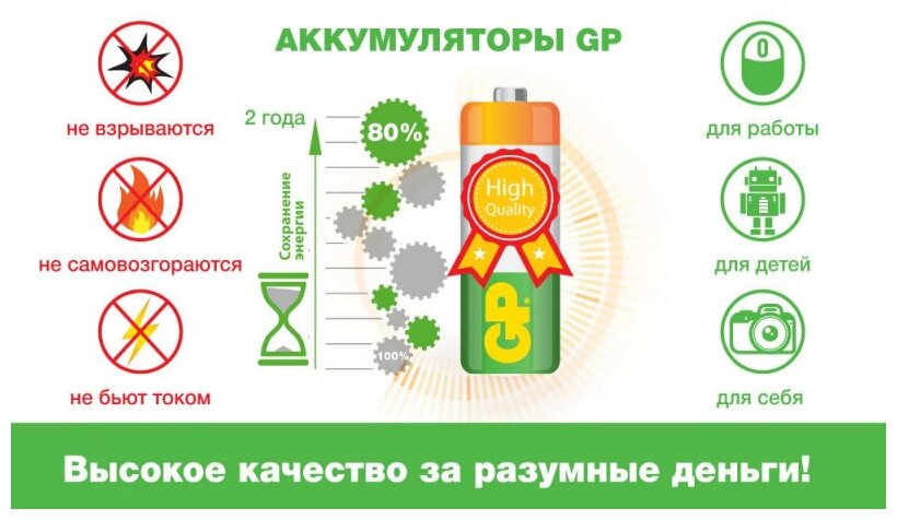 Аккумуляторы "AAA" GP 100AAAHC-2 (NiMH, 1.2V, 1000mAh), упаковка 2шт. 602 ₽ Подробнее