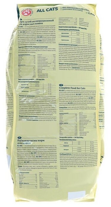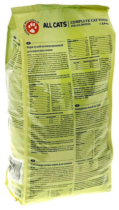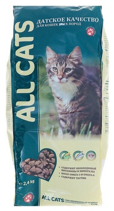 Лучшие цены. Корм сухой полнорационный для взрослых кошек с курицей, 2,4 кг. ALL CATS – это полнорационный премиальный корм для кошек всех пород. Он разработан на основе результатов последних исследований в области питания домашних животных, а также с учетом международных стандартов (AAFCO/FEDIAF). ALL CATS идеально подходит в качестве полноценного питания, поскольку содержит жизненно важные витамины и минералы. Жирные кислоты Омега-3 и Омега-6, содержащиеся в составе, необходимы для здоровой кожи и красивой шерсти. Магазины в вашем городе.