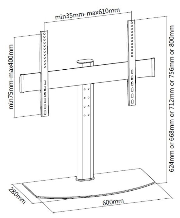 Лучшие цены. Настольная подставка iTECHmount KFS-2 с кронштейном для телевизора, станет отличным решением, при необходимости установить телевизор на горизонтальную поверхность. Стильный дизайн подставки из черного закаленного стекла, возможность регулировать высоту расположения телевизора на уровне 624 мм, 668 мм, 712 мм, 756 мм или 800 мм от поверхности стола, являются основными преимуществами и отличной альтернативой стандартным подставкам, идущим в комплекте с телевизорами. Магазины в вашем городе.