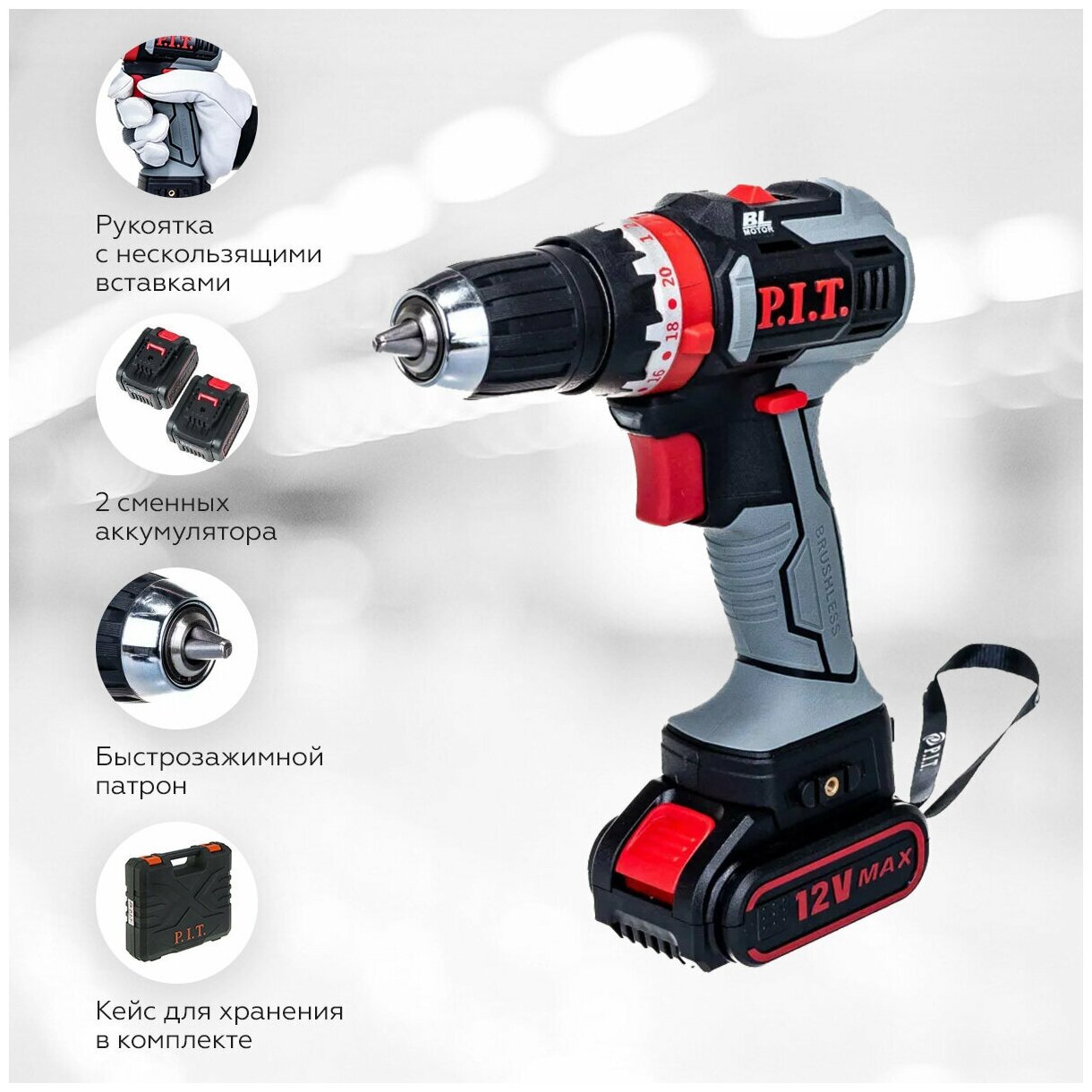 Дрель-шуруповерт ударная бесщеточная аккумуляторная P.I.T. PID03001-12M2/BL в кейсе, сменный аккумулятор, 12В, 28Нм, функция удара, 2 АКБ