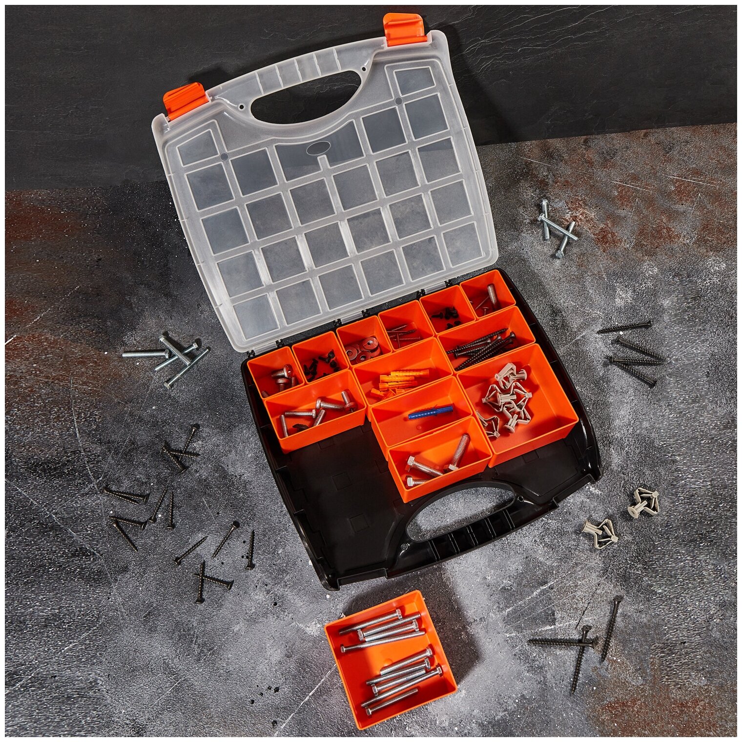 Лучшие цены. Ящик пластиковый для инструмента PROconnect 325х280х60 мм. С контейнерами для мелочей, предназначен для хранения различных мелочей, замок плотно фиксирует крышку, что обеспечивает сохранность вещей при транспортировке, прозрачная крышка создает дополнительные удобства при хранении, компактен, эргономичен, функционален. Магазины в вашем городе.