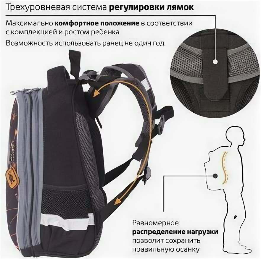 | Конструкция | жесткий каркас, ортопедическая спинка, мягкие лямки, S-образные лямки, светоотражатель |