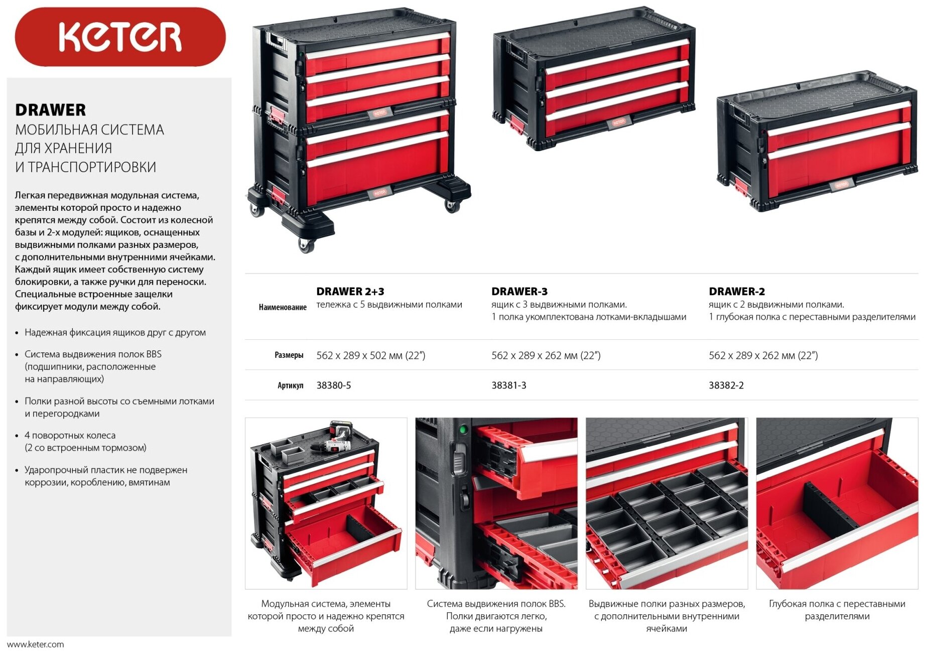Лучшие цены. Система хранения Drawer Tool Chest System от Keter состоит из 5 ящиков и предназначена для организации хранения инструментов и деталей. Это отличное решение для гаража, подвала или балкона. Система состоит из двух модулей, закрепленных между собой встроенными защелками. Благодаря удобным рукояткам ящики легко переместить на нужное место. Если вы хотите содержать ваши инструменты в порядке, тогда модульный стеллаж Drawer Tool Chest System от Keter — незаменимое приобретение для вас. Магазины в вашем городе.