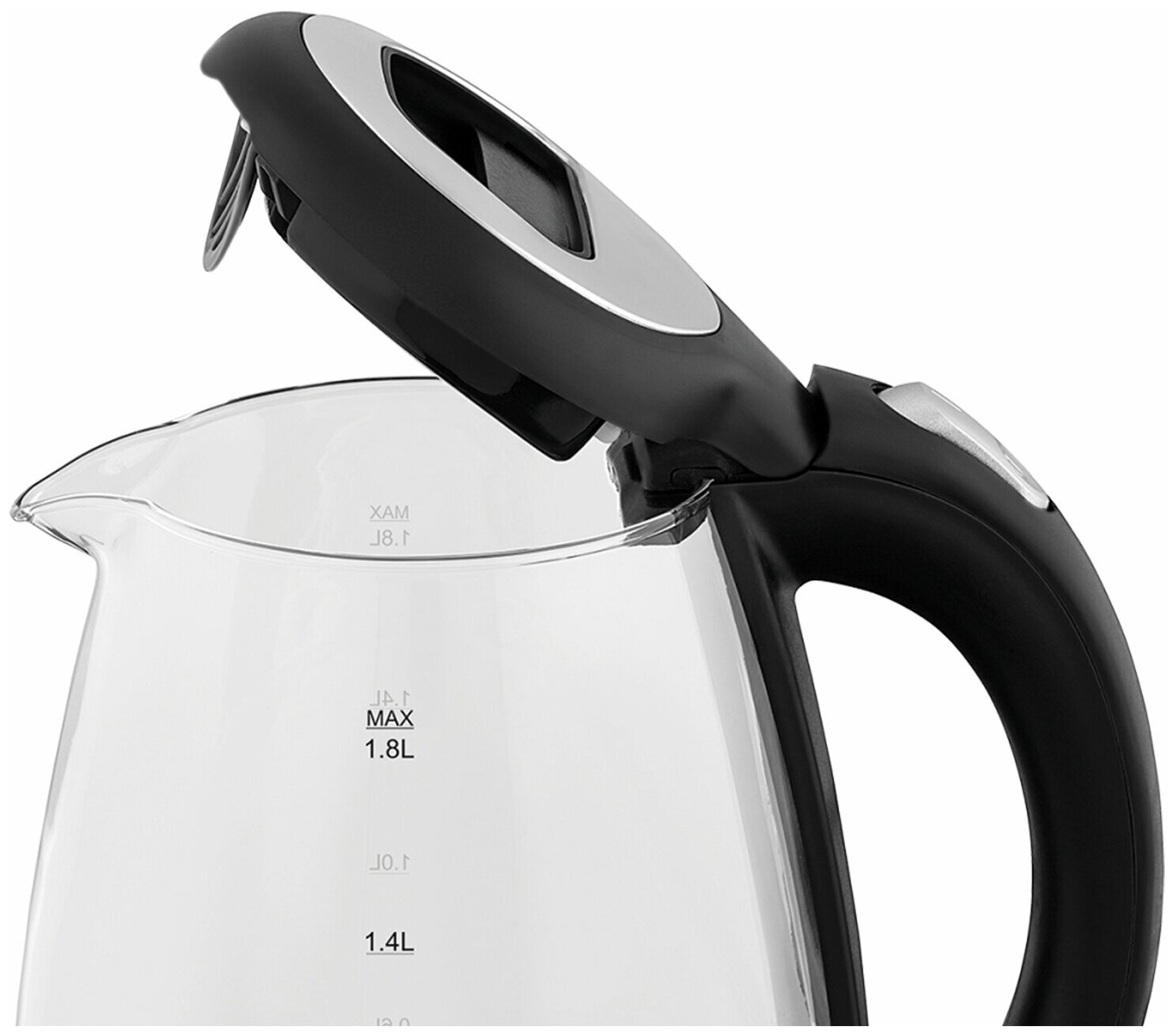 Лучшие цены. Общие характеристики Тип электрочайник Мощность 2000 Вт Объем 1.8 л Тип нагревательного элемента скрытый Особенности Индикатор включения есть Индикатор уровня воды есть Автоматическое отключение есть Подсветка воды есть Отсек для шнура есть Корпус Материал корпуса стекло Цвет черный Гарантия 12 мес. Магазины в вашем городе.