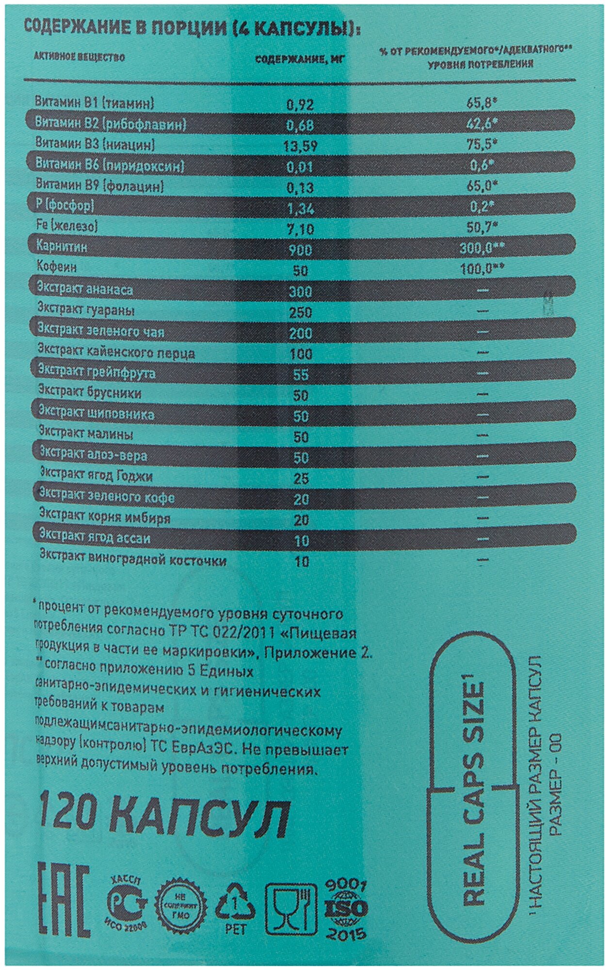 | Состав | L-карнитинкофеингуаранаэкстракт зеленого чаярастительные экстрактыэкстракт перца витамины минералы (кайенского) |