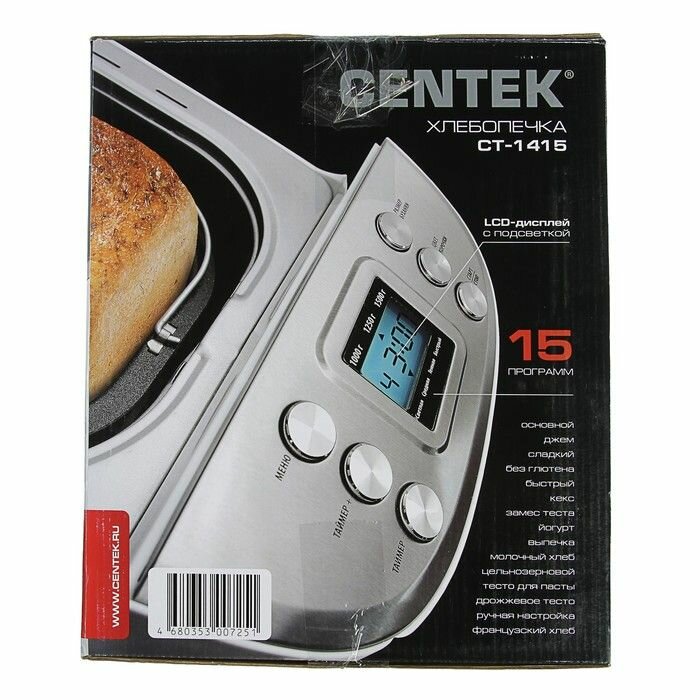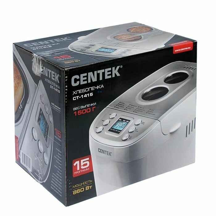 Хлебопечка Centek CT-1415 (бел/сталь) 1500 г большой объём, 860Вт, 15 программ, таймер, LCD, окошко белый цвет