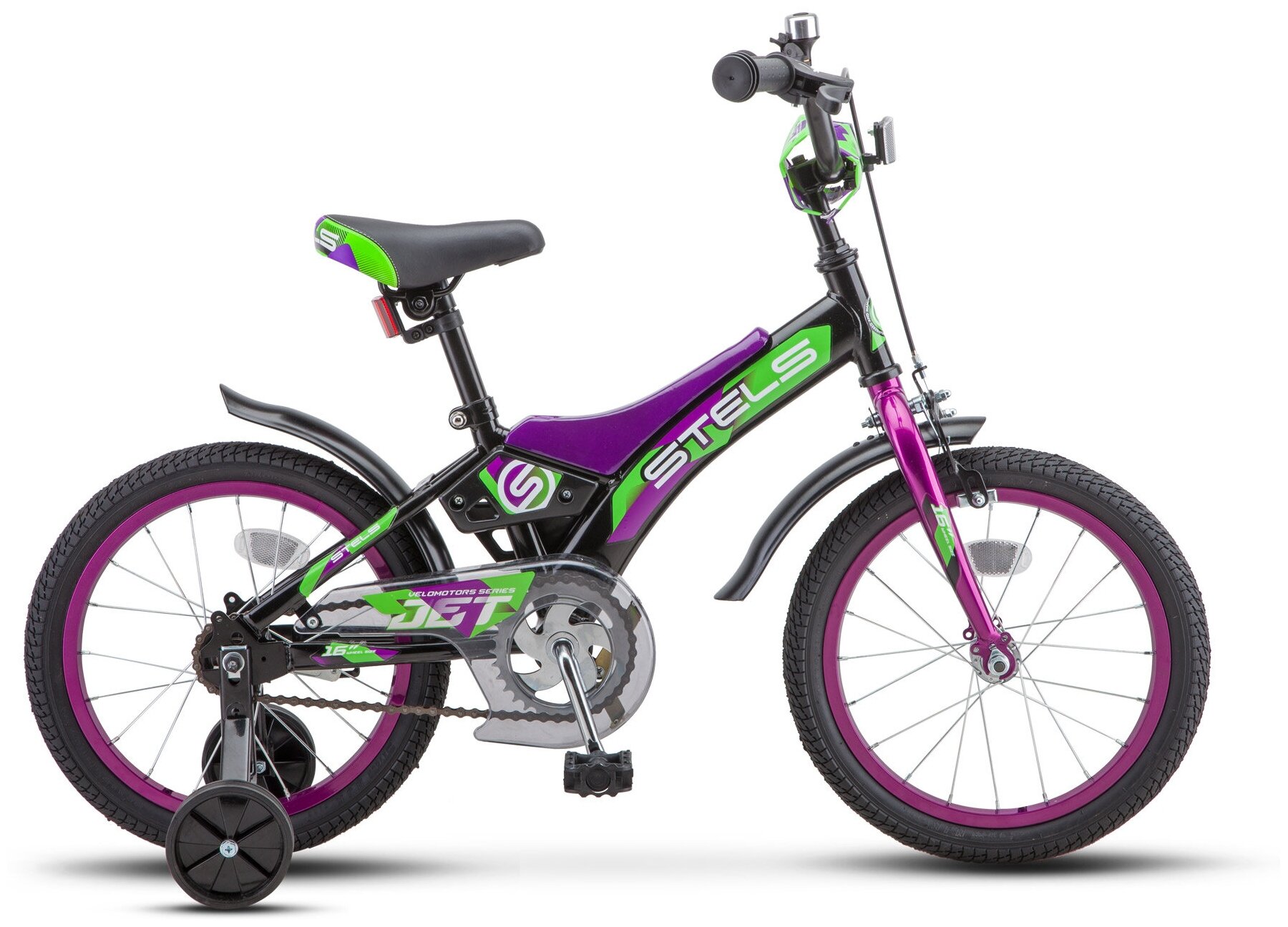 Лучшие цены. Детский велосипед STELS (Стелс) Jet 16” Z010 чёрный/фиолетовый/зелёный предназначен для малышей от трех лет. В данной модели присутствуют съемные боковые колеса, с помощью которых ребенок быстро научится кататься. В комплектацию входят: прочная рама из высококачественной стали, жесткая вилка, два тормоза - задний (ножной педальный), передний (ручной клещевой), защита цепи, крылья и звонок. STELS Jet 16” максимально удобный и выгодный вариант. Отлично подойдет для обучения и прогулок по городским паркам. Магазины в вашем городе.