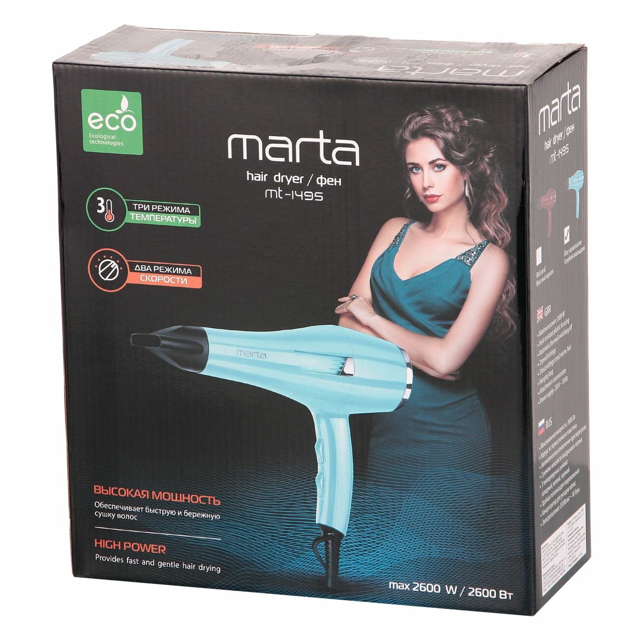 Фен для волос Марта MT-1495 сверхмощный с защитой от перегрева, аквамарин, 3 температурных режима, 2 режима мощности, 1 насадка, 2600Вт шнур 1.65м