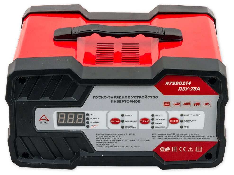 Лучшие цены. Название Пуско-зарядное устройство ARNEZI ПЗУ-75А. Категория Зарядные и пуско-зарядные устройства для аккумуляторов. Тип пуско-зарядное устройство. Напряжение АКБ 12-24 В. Минимальная емкость АКБ 8 А·ч. Максимальная емкость АКБ 225 А·ч. Минимальный ток заряда 2 А. Максимальный ток заряда 16 А. Регулирование тока заряда автоматическое. Минимальный ток пуска 75 А. Максимальная потребляемая мощность (зарядка) 620 Вт. Напряжение питания от сети 220 В. Индикация светодиодная, цифровая. Магазины в вашем городе.