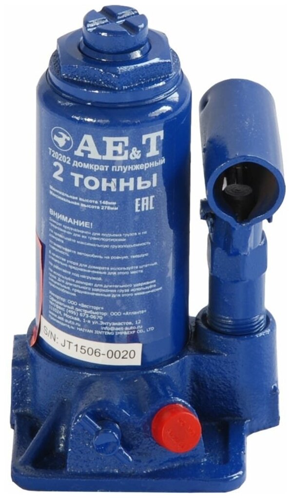 AE&T T20202 Домкрат бутылочный, 2т (высота подхвата - 148мм, высота подъема - 278мм)