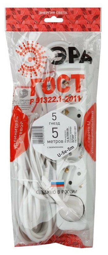 Лучшие цены. Удлинитель U-5e-5m ЭРА c заземл., 3х1мм2, 16А, ПВС, 5гн, 5м От 1шт. Производитель ЭРА Страна россия. Магазины в вашем городе.