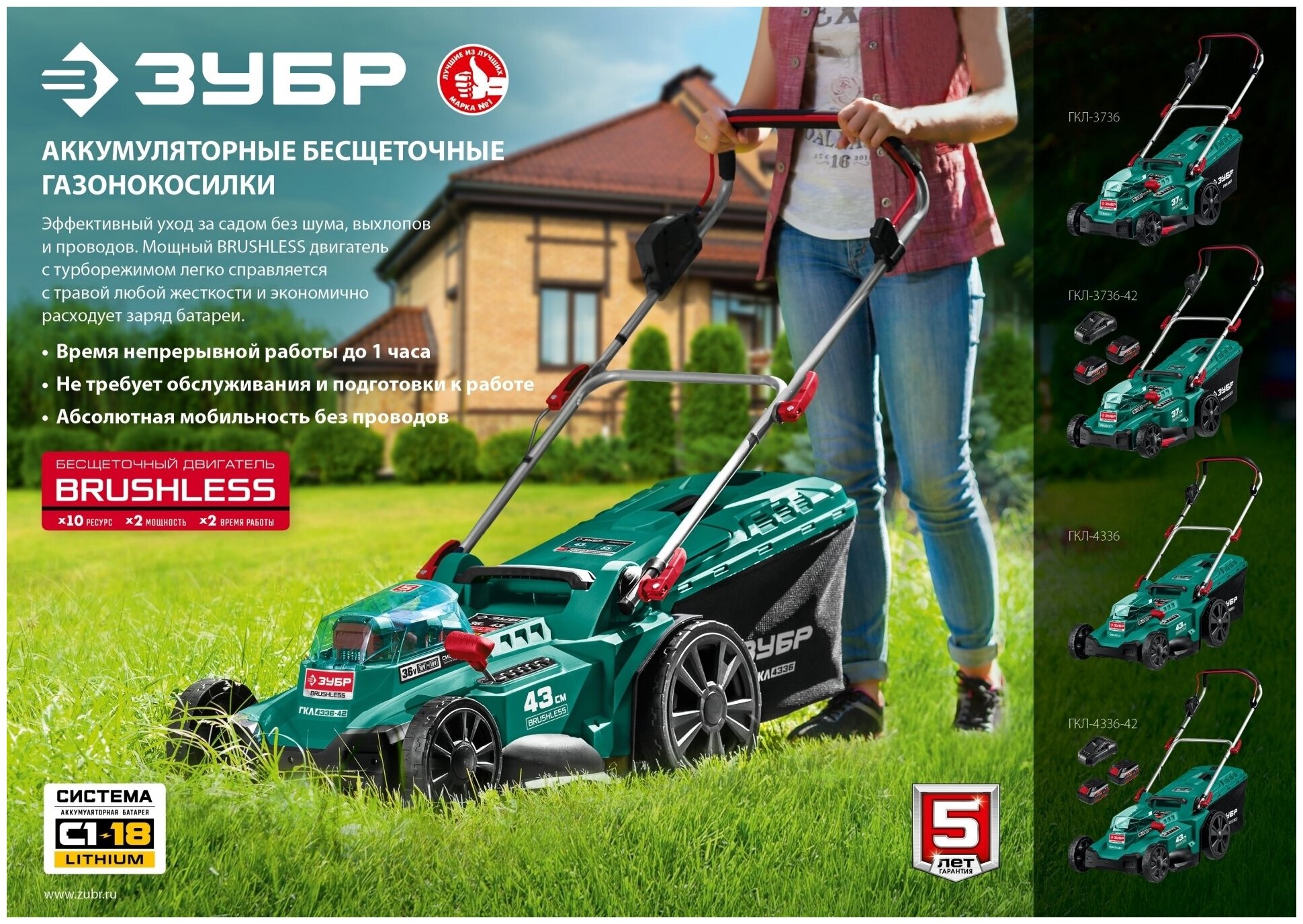 Бесщёточная аккумуляторная газонокосилка 2х18В АКБ Зубр ГКЛ-3736-42