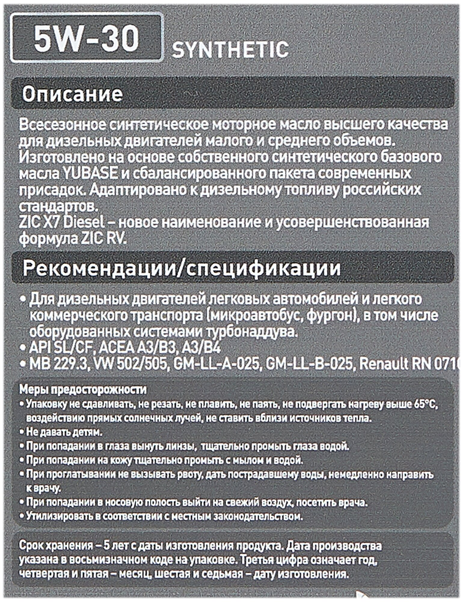 Zic1 ZIC Масло моторное ZIC X7 Diesel 5W-30 синтетическое 6 л 172610