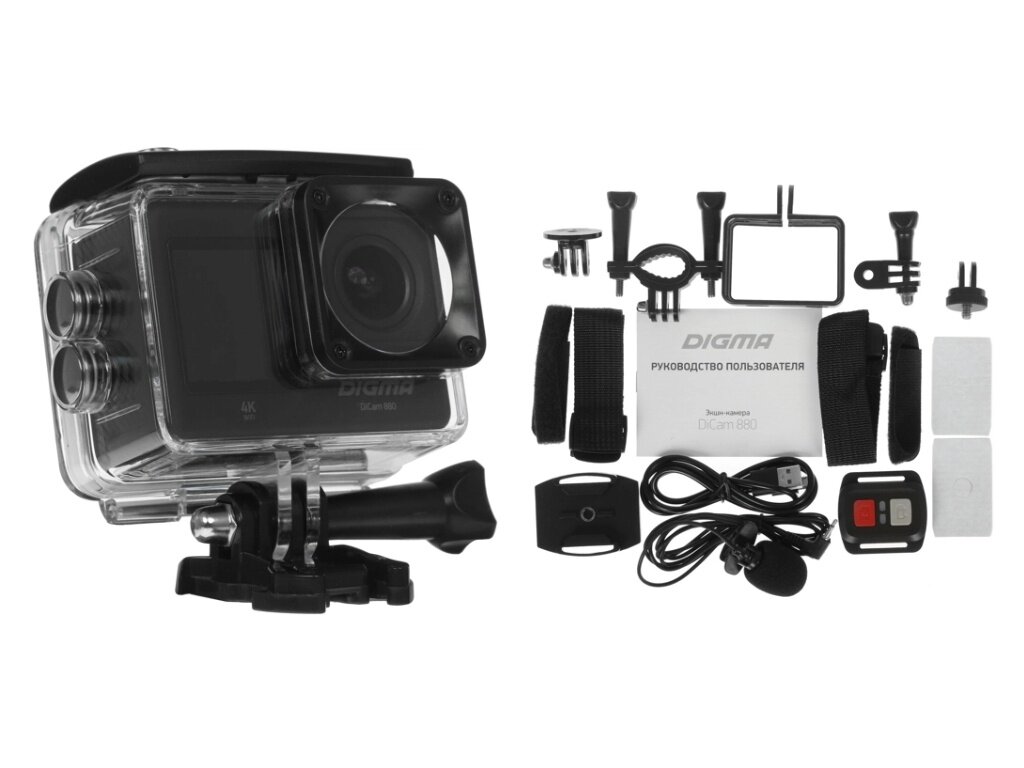 Экшн-камера Digma DiCam 880 (внешний микрофон/пульт ДУ), 4K, WiFi, черный [dc880]