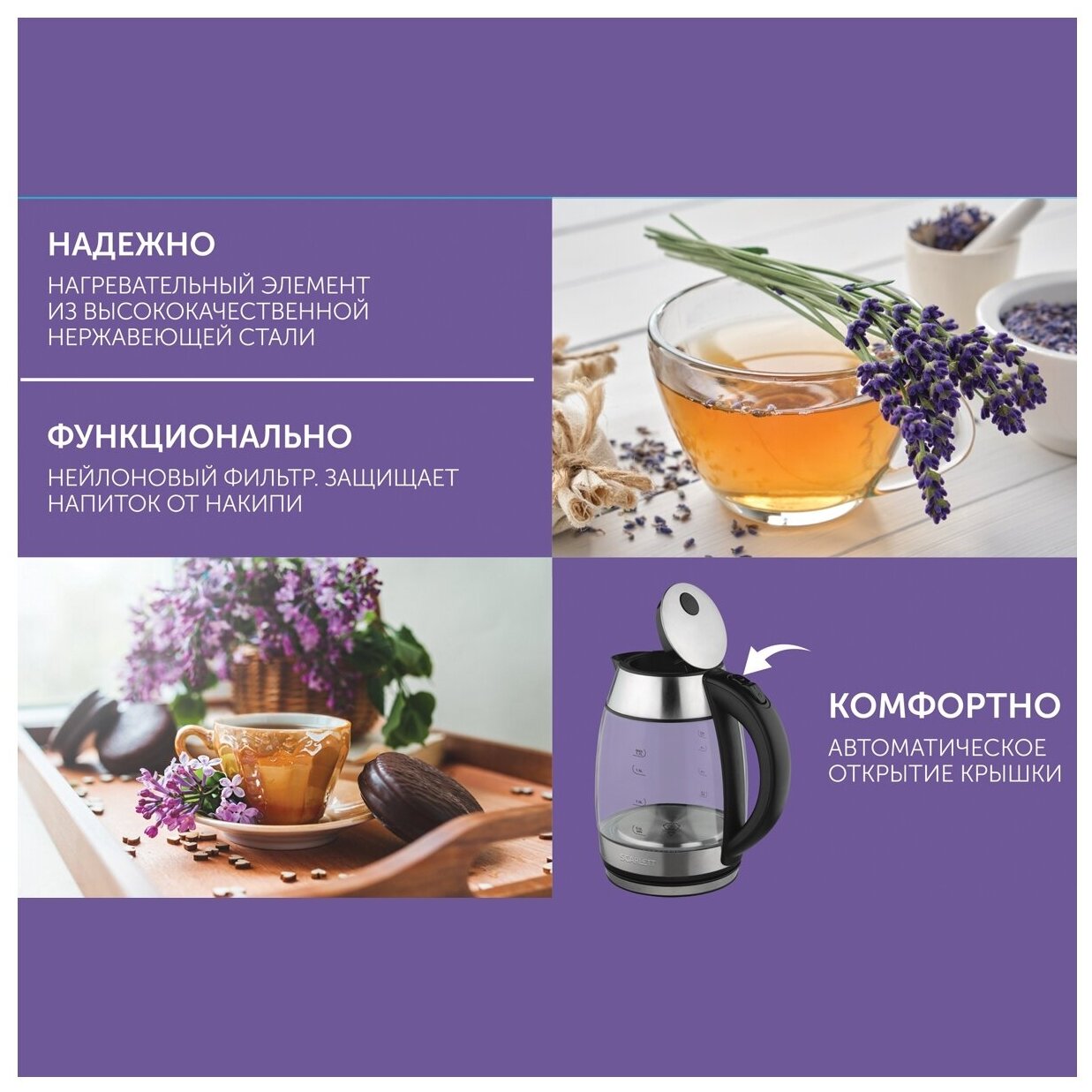 Лучшие цены. Электрический чайник SC-EK27G94 объемом 1.7 л оснащён автоматической системой открытия крышки. Эргономичная ручка, закрытый нагревательный элемент сделают эксплуатацию прибора еще проще и комфортнее. Нейлоновый фильтр предотвратит попадание накипи в напиток. Классическое сочетание цветов позволит прибору вписаться любой в интерьер кухни. Магазины в вашем городе.