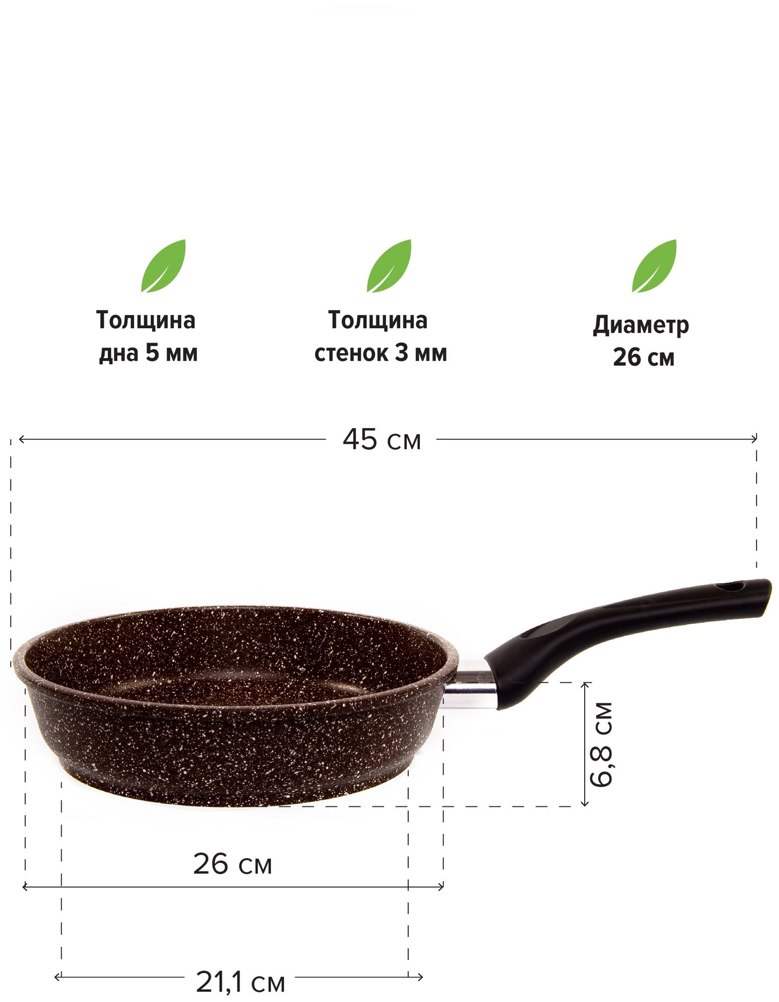 Лучшие цены. Серия " гранит CHOKOLATE" литая алюминиевая посуда с антипригарным покрытием. Сковорода а/п литая 26см. Имеет современное экологически безопасное многослойное покрытие, которое обеспечивает превосходный внешний вид и великолепные условия эксплуатации. Обладает повышенной теплоемкостью. Толщина стенок и дна: 4,0/6,0 мм, что обеспечивает быстрый и равномерный нагрев. Внутренний диаметр дна – 21,0см Высота стенок внутренняя и внешняя 6,10/6,7 см. Магазины в вашем городе.