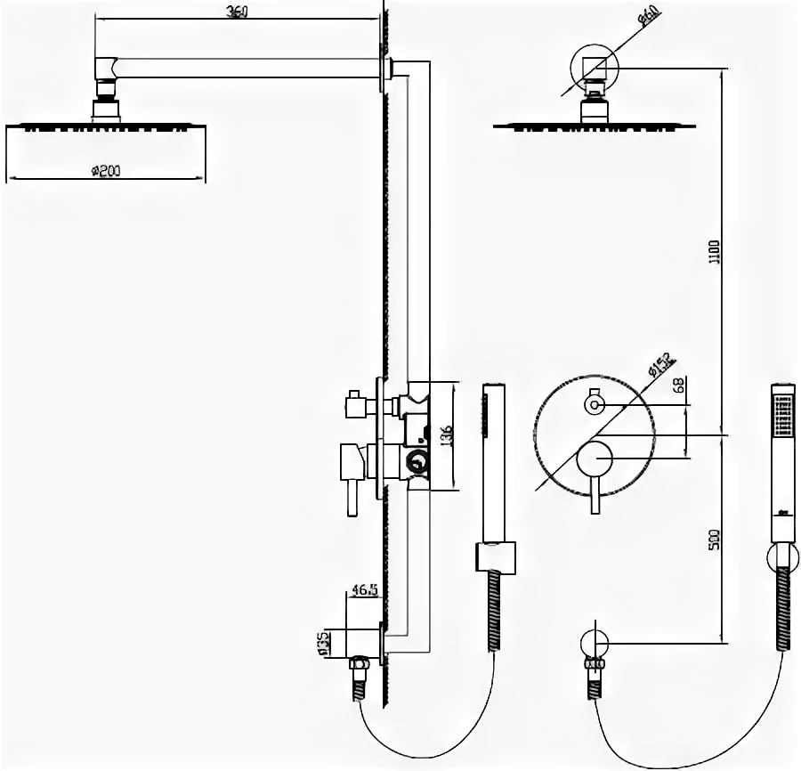 | Комплектация | ручной душ (душевая лейка) / верхний душ (тропический) / смеситель / душевой шланг / крепление ручного душа / настенный кронштейн |