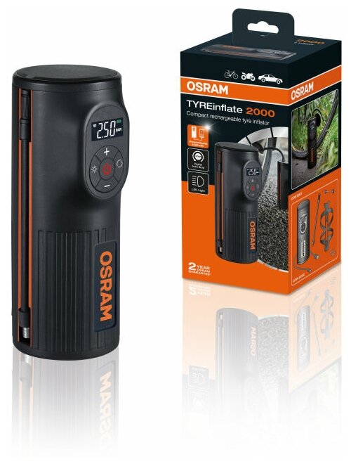 Лучшие цены. OSRAM TYREinflate 2000 - это перезаряжаемый шинный насос с цифровым дисплеем с подсветкой для более простого и точного измерения давления и накачивания шин, который отображает значения давления в барах, кПа и фунтах на квадратный дюйм. OSRAM TYREinflate 2000 имеет внутреннюю память, и благодаря функции памяти можно запрограммировать и сохранить до четырех различных значений для разных шин. Характеристика: Время зарядки - 3 часа. Длина воздушного шланга - 14,5 см. Магазины в вашем городе.