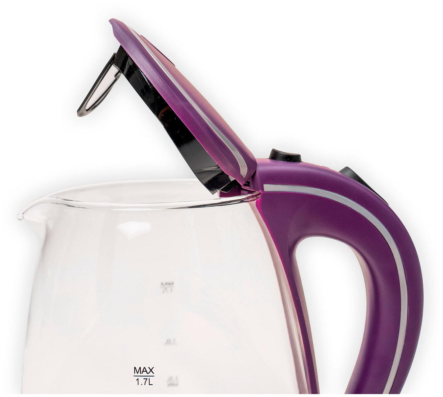 Лучшие цены. Электрический чайник KRAFT KF-1702VI отличается надежностью, привлекательным дизайном и удобством в эксплуатации. Чайник с приятной синей светодиодной подсветкой станет украшением для вашей кухни. Получайте удовольствие от любимых напитков в атмосфере уюта! Корпус данной модели выполнен из закаленного стекла, которое отличается повышенной прочностью. Прозрачное стекло с отметками объема с двух сторон позволяет вскипятить ровно столько воды, сколько нужно, не расходуя излишнюю электроэнергию и сохраняя. Магазины в вашем городе.
