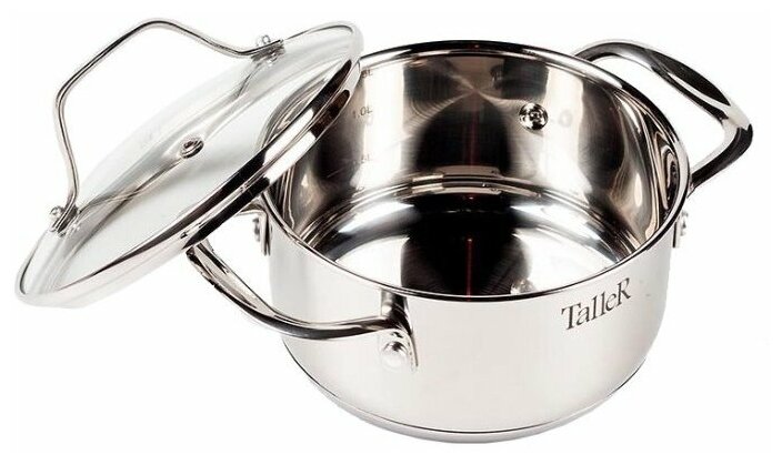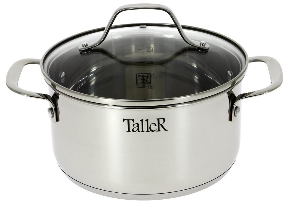 Лучшие цены. Кастрюля из нержавеющей стали Taller TR-11084 «Элиас» с крышкой 5 Толщина стенок - 0,6 мм. Толщина дна - 2,8 мм. Полировка снаружи - зеркальная, внутри - зеркальная. Крышка из жаропрочного стекла со стальным ободом с отверстием для выхода пара. Ручки на клепках. Есть отметки литража. Кастрюля подойдет для приготовления обедов и ужинов для большой семьи, а лаконичный дизайн будет гармоничен на любой кухне. Подходит для мойки в посудомоечной машине. Нельзя использовать в духовом шкафу. Магазины в вашем городе.