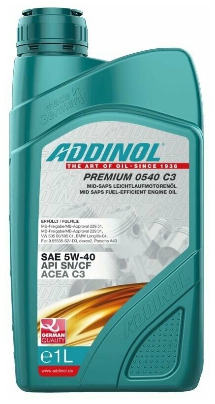 Лучшие цены. ADDINOL Premium 0540 C3 — это высокомощное синтетическое моторное масло легкого хода со свойством Longlife класса SAE 5W-40. Отличные характеристики обеспечиваются высококачественными тщательно подобранными базовыми маслами и высокомощным пакетом присадок. Данный продукт предлагает оптимальную защиту двигателей от коррозии, износа и отложений. области применения Рекомендуется для новейшего поколения дизельных и бензиновых двигателей Euro IV. Магазины в вашем городе.