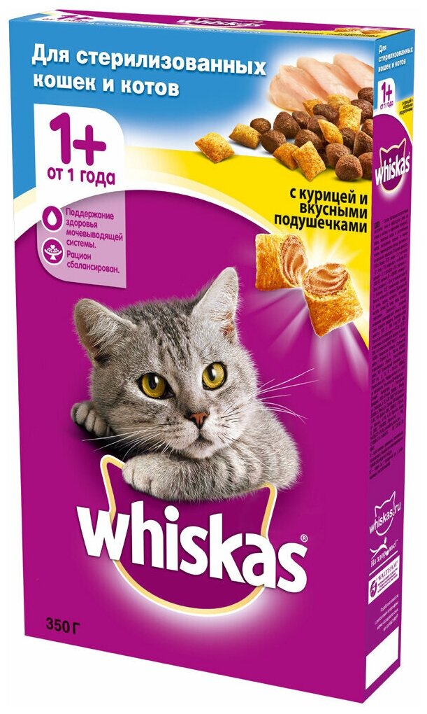 Лучшие цены. Whiskas для стерилизованных кошек создан с учётом особых потребностей питомца. Хрустящие подушечки с нежным паштетом внутри обязательно придутся по вкусу кошке. Кроме того, Whiskas содержит всё необходимое, чтобы рацион кошки был не только вкусным, но и полезным. Оптимальное сочетание питательных веществ и нутриентов помогает поддерживать обмен веществ и здоровье мочевыводящей системы. Витамин Е и цинк укрепляют иммунитет, а в сочетании с омега-6 цинк помогает поддерживать здоровье кожи и шерсти питомца. Магазины в вашем городе.