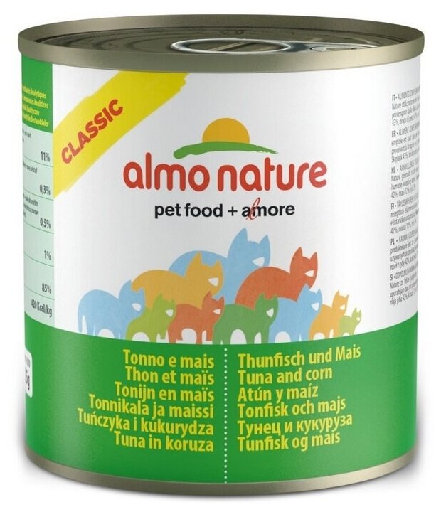 Лучшие цены. Консервы Almo Nature quot;Classic quot; - сбалансированный влажный корм для кошек, изготовленный из ингредиентов высшего качества, являющихся натуральными источниками витаминов и питательных веществ. Состав: куриное филе 50 , рыбный бульон 42 , тунец 5 , рис 3 . Гарантированный анализ: белок - 14 , клетчатка - 0,5 , жиры - 0,5 , зола - 2 , влажность - 83 . Калорийность - 530 ккал/кг. Товар сертифицирован. Уважаемые клиенты! Обращаем ваше внимание на то, что упаковка может иметь несколько видов дизайна. Магазины в вашем городе.