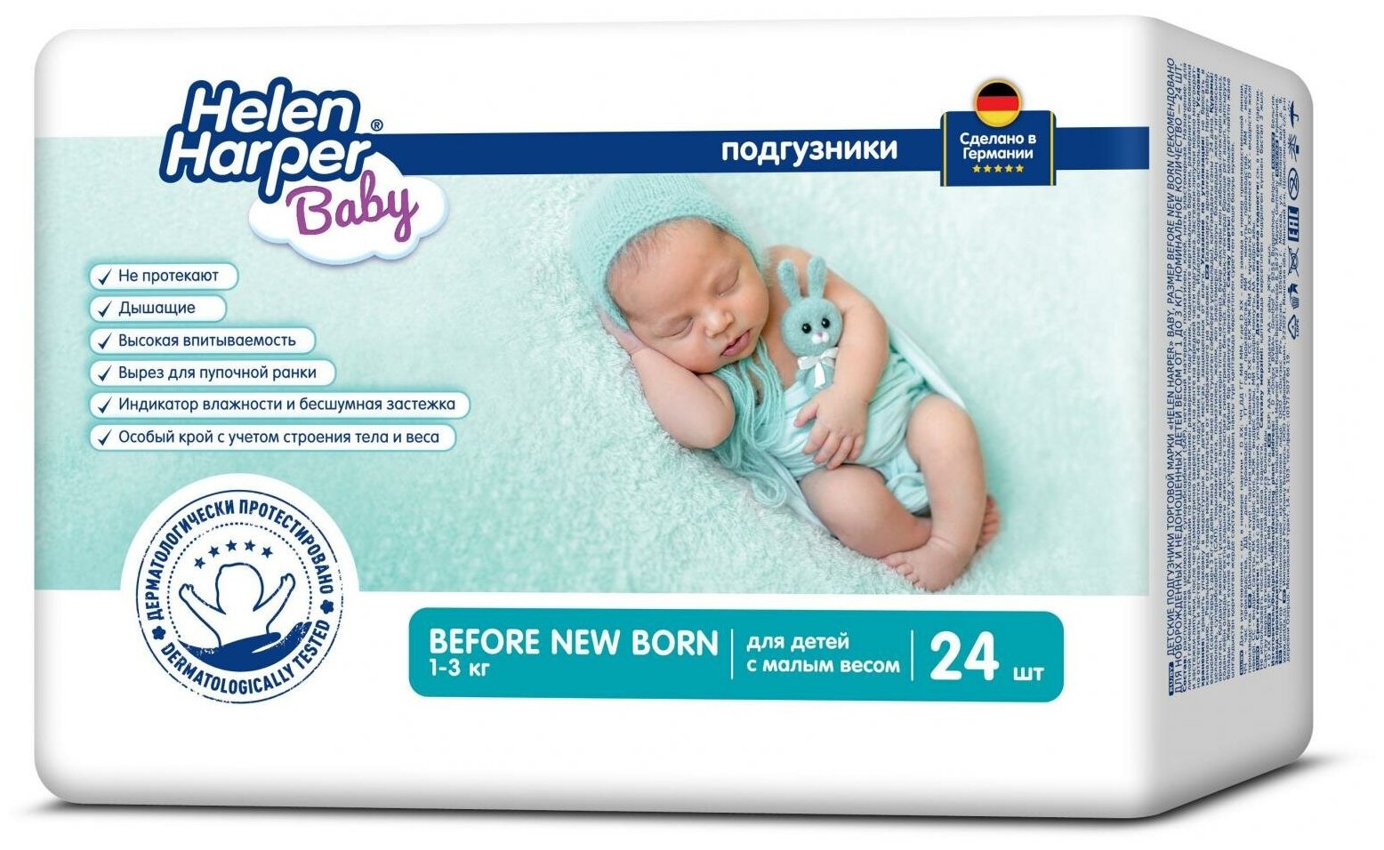 Лучшие цены. Helen Harper Baby Подгузники для новорожденных и недоношенных (1-3 кг) 24 шт. - обеспечивают до 8 часов сухости, чтобы спать спокойно комфортно малышам, удобно мамам. Особенности: впитывают жидкость и надежно удерживают ее внутри исключают протекания очень мягкие материалы и особый крой специальный вырез в области пуповины индикатор влажности Очень мягкие внутри и снаружи, они изготовлены с учетом новейших разработок и не уступают по качеству лидерам рынка. Магазины в вашем городе.