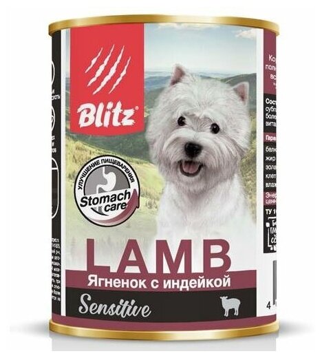 Blitz Sensitive Adult Dog влажный корм для взрослых собак с чувствительным пищеварением, с ягненком и индейкой, в консервах - 400 г х 24 шт