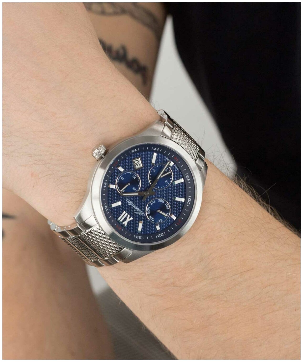 Лучшие цены. Практичные и удобные часы в стильном дизайне гармонично впишутся в повседневный стиль одежды. Multifunction. Циферблат с окошком даты. 12-ти и 24-х часовой формат времени. 24-х часовой формат отображается центральной стрелкой. День недели отображается на отдельном циферблате. Секундная стрелка вынесена на отдельный циферблат. Браслет с раскладывающейся застежкой. Производитель оставляет за собой право вносить изменения во внешний вид часов. Магазины в вашем городе.