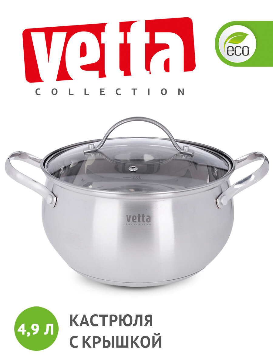 Кастрюля нерж сталь 4,9л Vetta Женева 22х12,5см со стеклянной крышкой , индукция