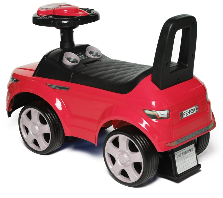 Лучшие цены. Этот спорткар с кожаным сиденьем уже ждет юных автолюбителей и готов покорять улицы города. Износостойкие резиновые колеса обеспечивают дополнительную амортизацию при езде. Поворотный руль оснащен световыми и звуковыми эффектами (батарейки в комплект не входят). Поэтому она "растет" вместе с малышом. Модель не имеет острых углов, выполнена из ударопрочного и гипоаллергенного пластика. Специальные стопоры спереди и сзади защитят каталку от опрокидывания. Под сиденьем есть отсек для хранения мелочей. Магазины в вашем городе.